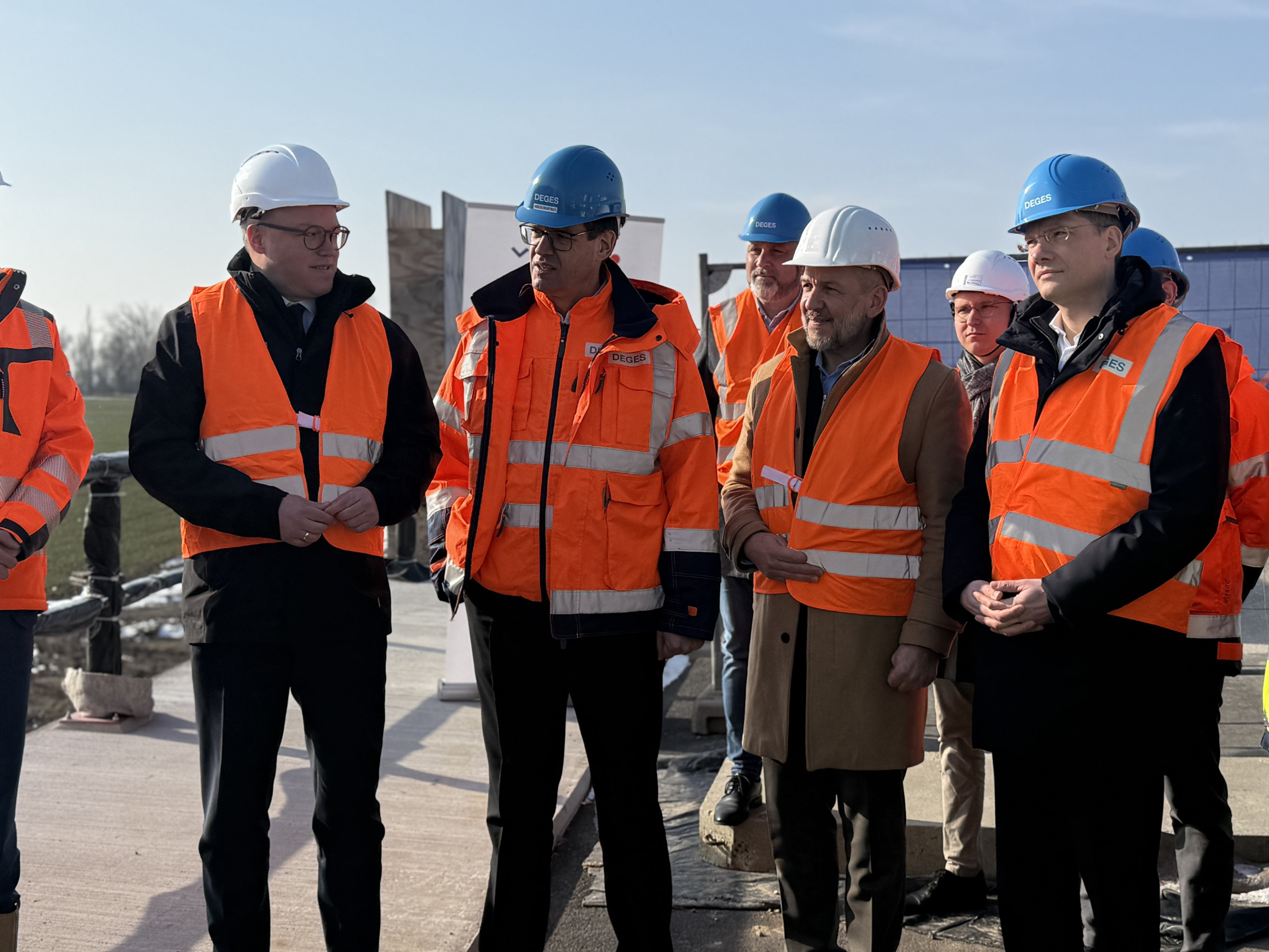 Im weiteren Verlauf der Tour stand ein Besuch des größten Infrastrukturprojektes des Freistaats Thüringen auf dem Programm. Daniel Markau, Projektleiter der DEGES, und François-Régis Lemière, Executive Direktor Europa des Auftragnehmers Via Mühlhausen, gaben einen detaillierten Überblick über den aktuellen Stand des größten Infrastrukturprojektes des Freistaats Thüringen. Landrat Thomas Ahke und Dr. Johannes Bruns, Oberbürgermeister von Mühlhausen, betonten die enorme Bedeutung dieses Projektes für die Region. In ca. sechs Monaten soll die neue B247 fertiggestellt werden – ein Zeitplan, der mit Zuversicht verfolgt wird.