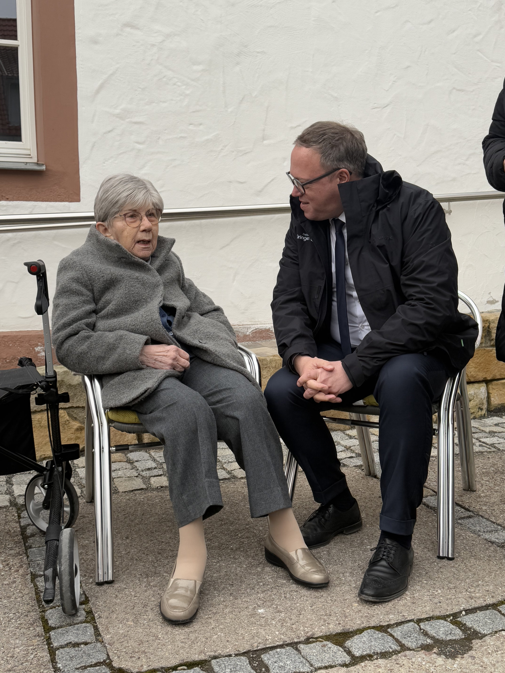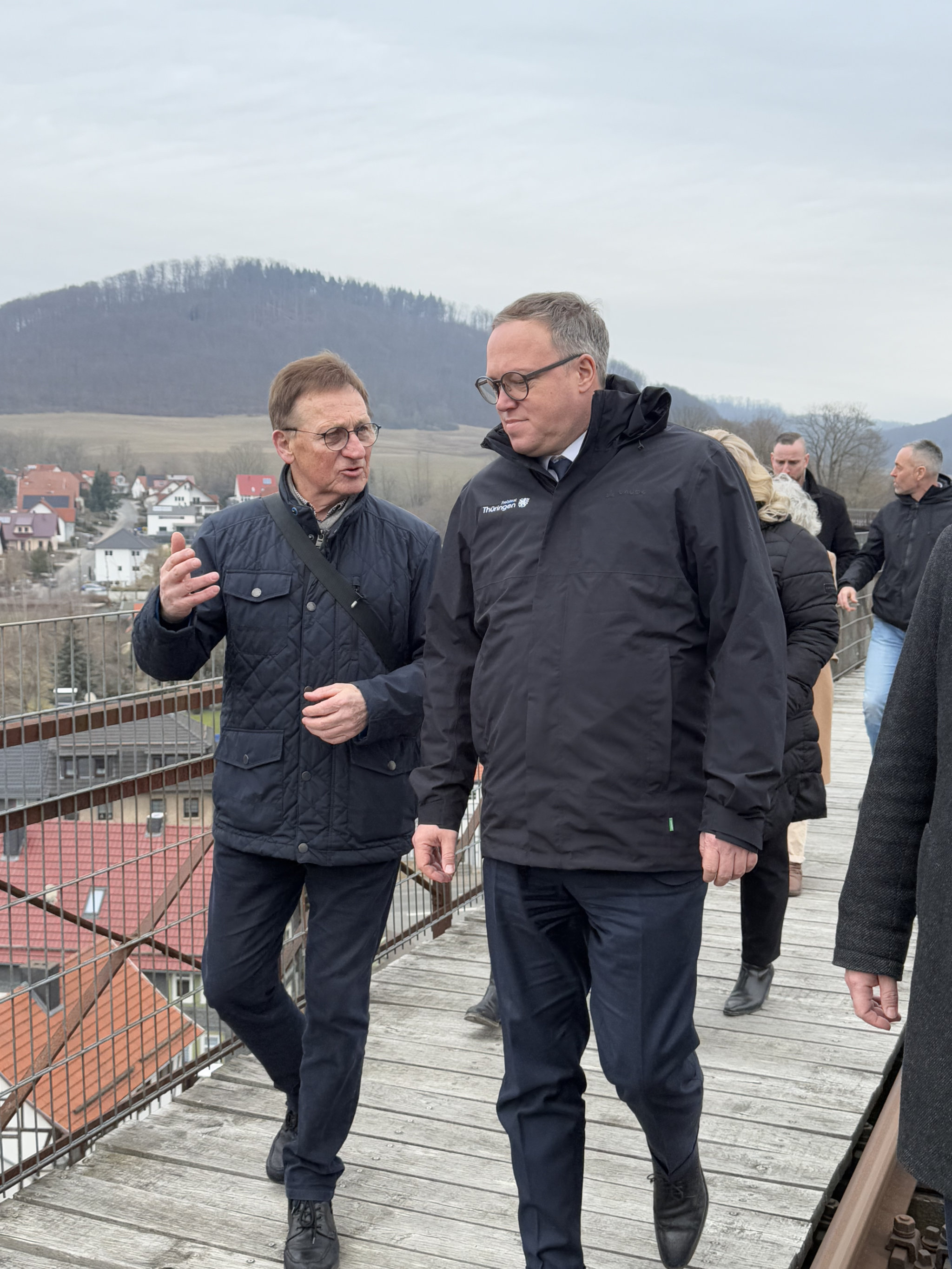Die letzte Station der Tour führte nach Lengenfeld Stein, wo Mario Voigt auf Schloss Bischofstein von Katja Hopf, Geschäftsführerin des WPZ Wohn- und Pflegezentrum Unstrut Hainich gGmbH, sowie den Bewohnern des Hauses empfangen wurde. Hier konnte der Ministerpräsident Fragen einiger Bewohner beantworten und sich mit den Anwesenden austauschen. Bei einer Fahrt mit der Elektro-Draisine erhielten die Teilnehmer der Landkreistour einen Blick auf das Viadukt, dessen Sanierung der Kastenträger dringend notwendig ist. Der Kanonenbahnverein berichtete von den baulichen Problemen und den hohen Sanierungskosten.