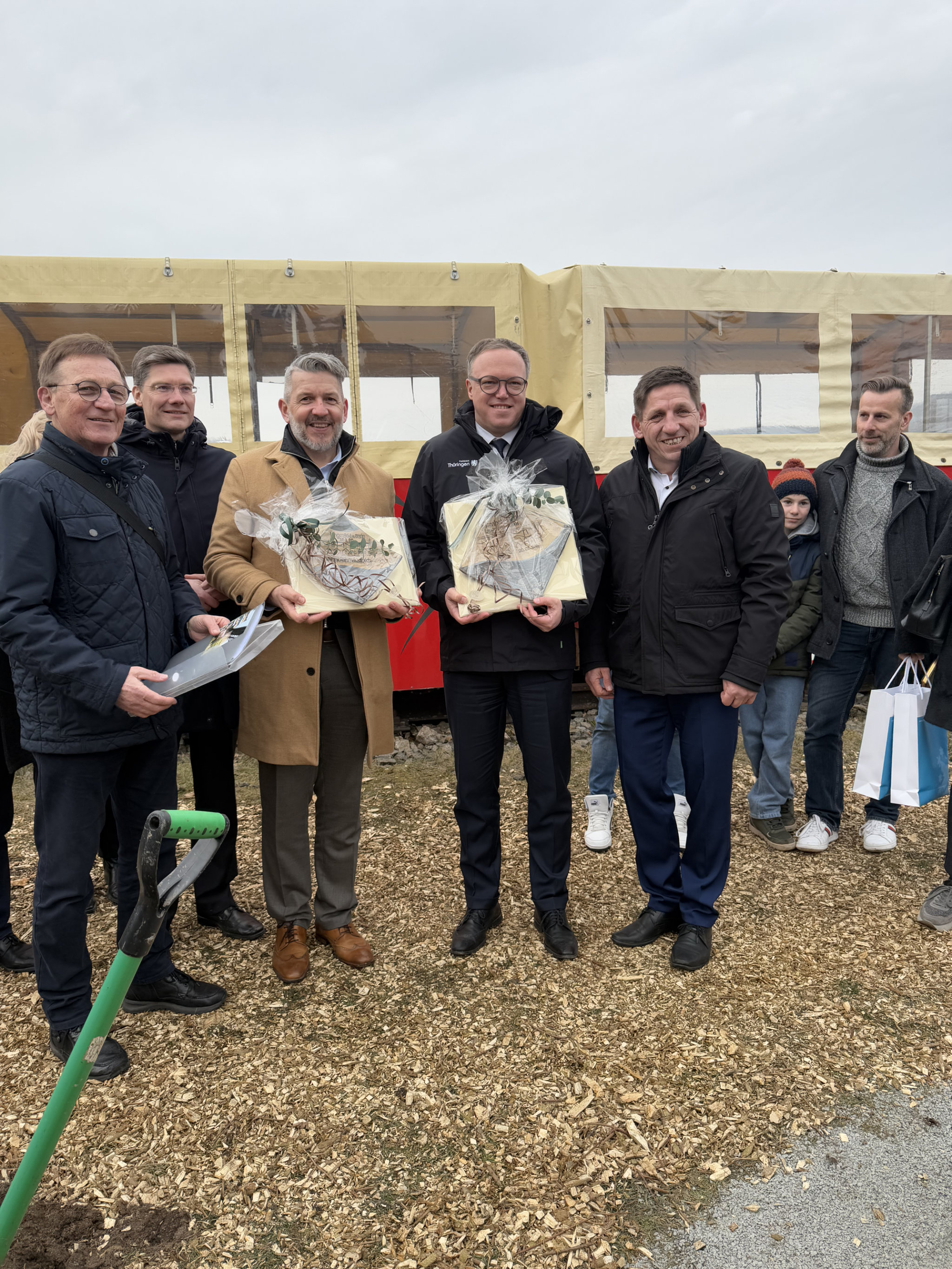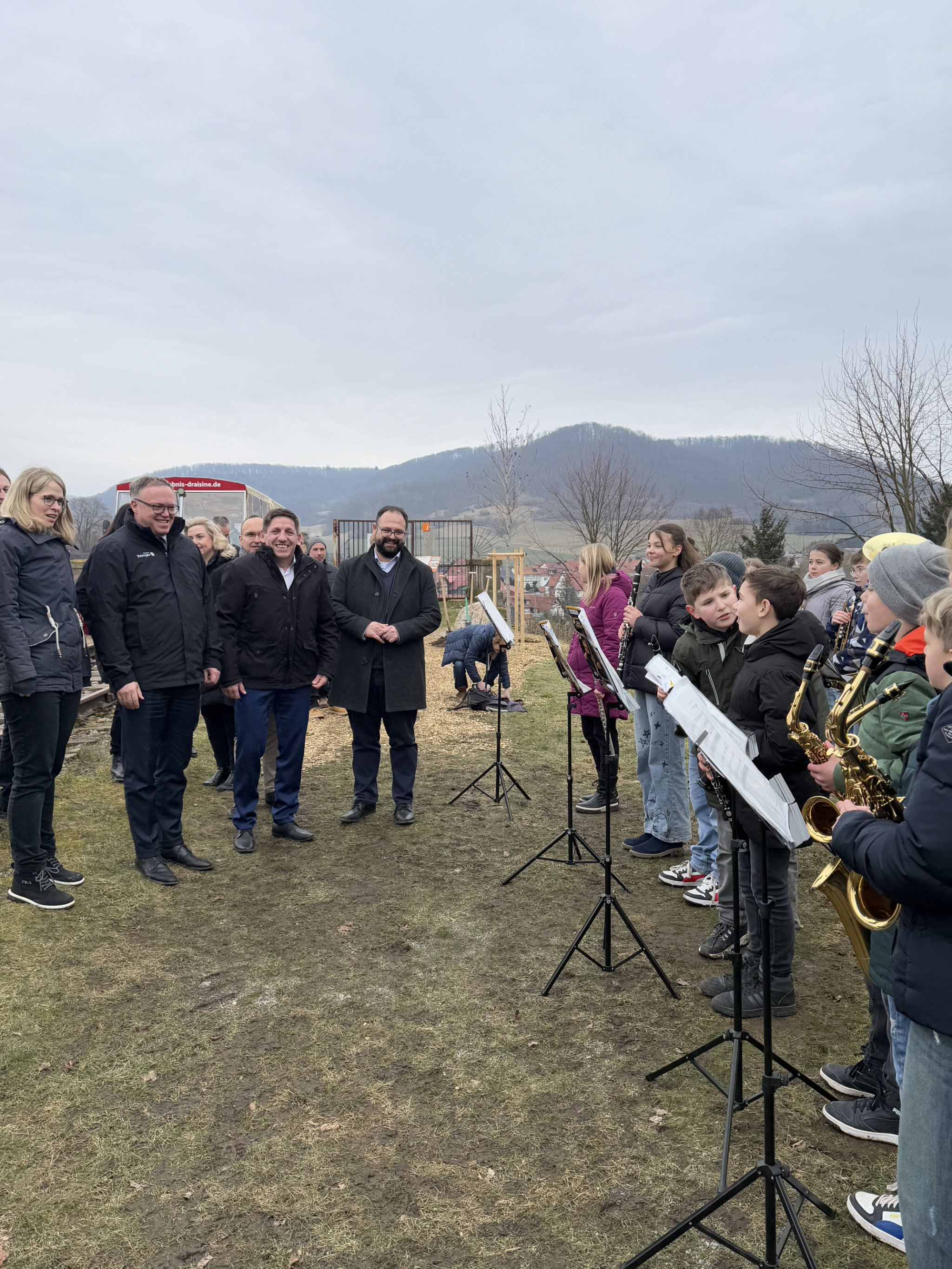 Am Bahnwärterhäuschen wurde Mario Voigt von dem Blasorchester des örtlichen Gymnasiums willkommen geheißen. Zum Abschluss der rundum gelungenen Landkreistour pflanzten Bürgermeister Andreas Henning, Landrat Thomas Ahke und Ministerpräsident Mario Voigt gemeinsam einen Amberbaum.