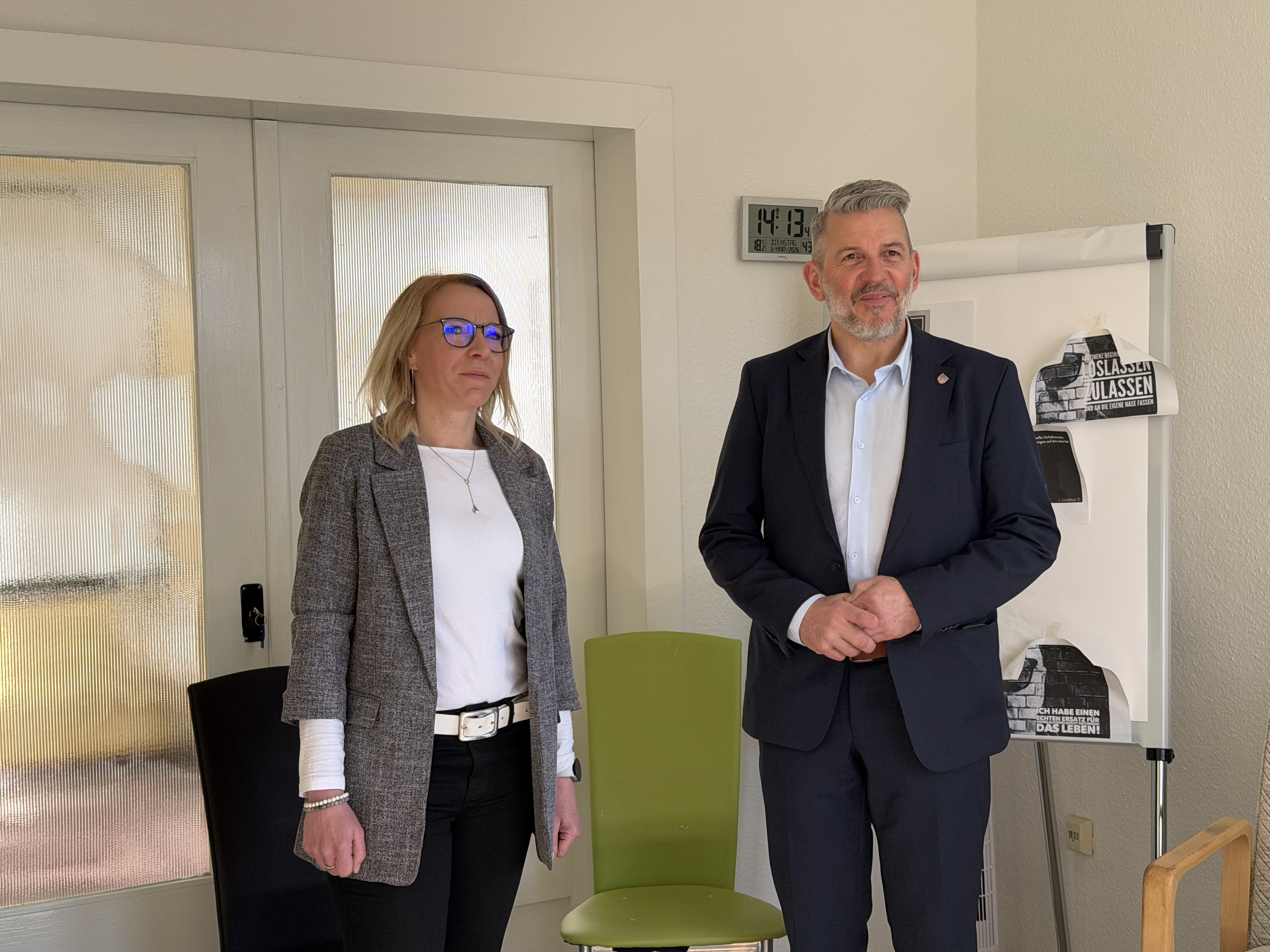 Mandy Prütz und Geschäftsführer der Suchthilfe in Thüringen David Fritzlar nahmen sich viel Zeit, die vielfältigen Angebote vorzustellen. Die Einrichtung berät Menschen mit Abhängigkeitserkrankungen von Alkohol und illegalen Drogen über Medikamente bis hin zu Verhaltenssüchten wie Glücksspiel oder exzessiver Internetnutzung. Auch Angehörige finden hier Unterstützung.
