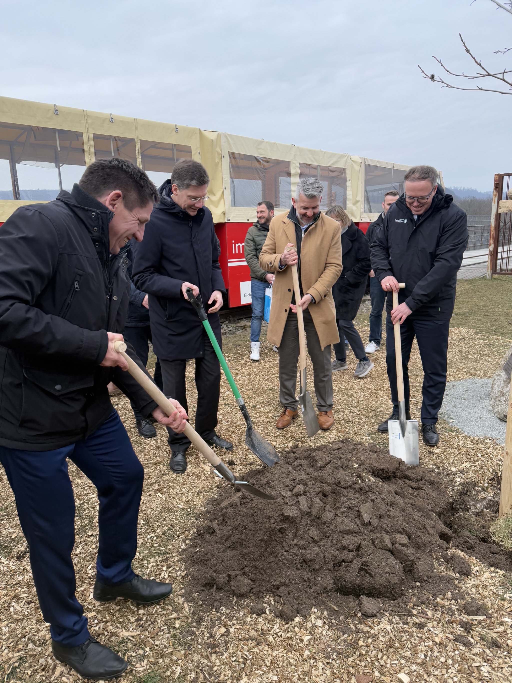 Am Bahnwärterhäuschen wurde Mario Voigt von dem Blasorchester des örtlichen Gymnasiums willkommen geheißen. Zum Abschluss der rundum gelungenen Landkreistour pflanzten Bürgermeister Andreas Henning, Landrat Thomas Ahke und Ministerpräsident Mario Voigt gemeinsam einen Amberbaum.